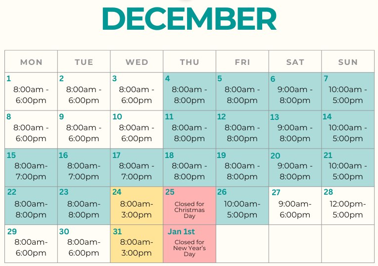 | Monday – Thursday | 8:00am to 6:00pm | Monday – Thursday | 8:00am to 5:30pm |
